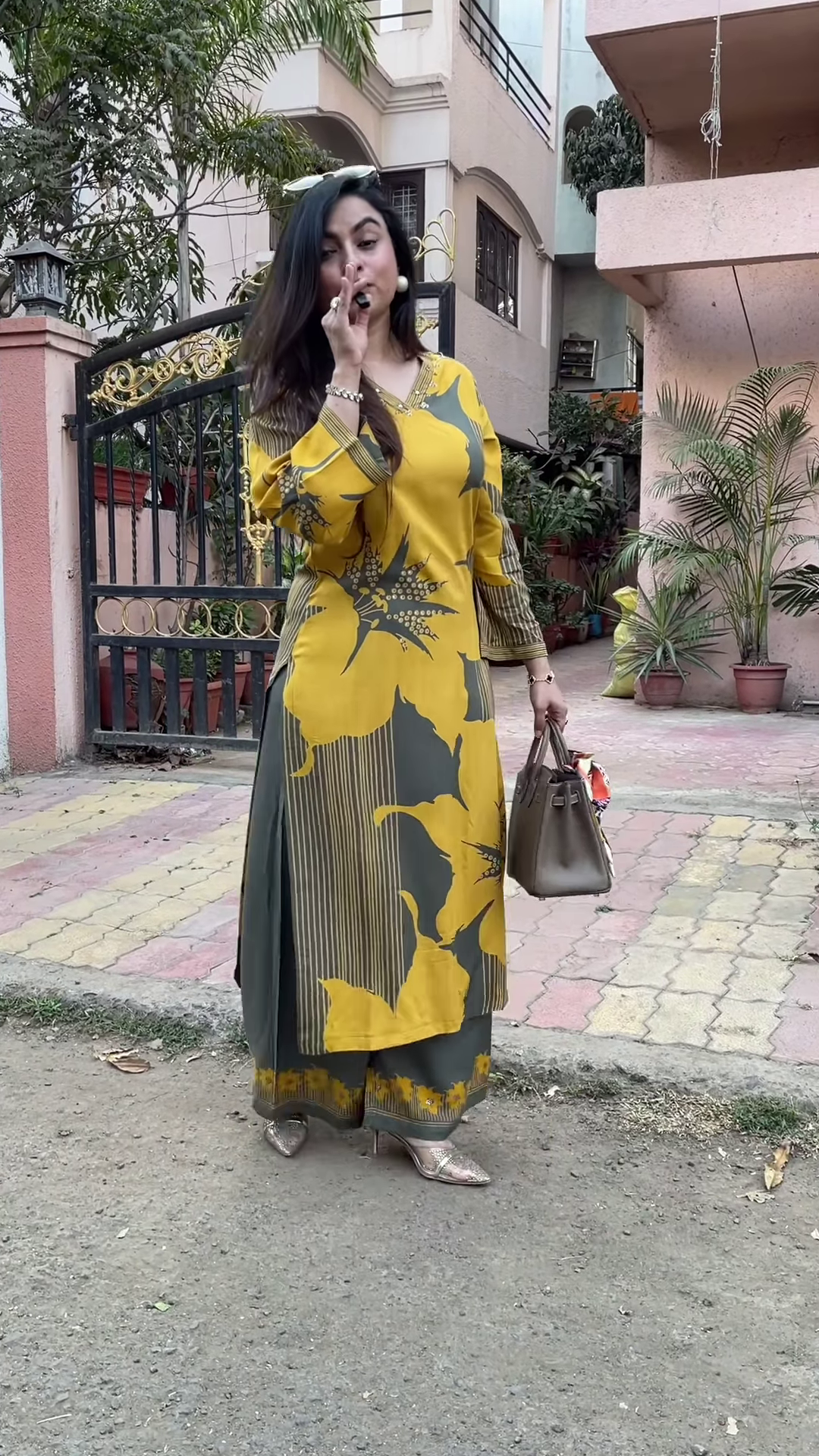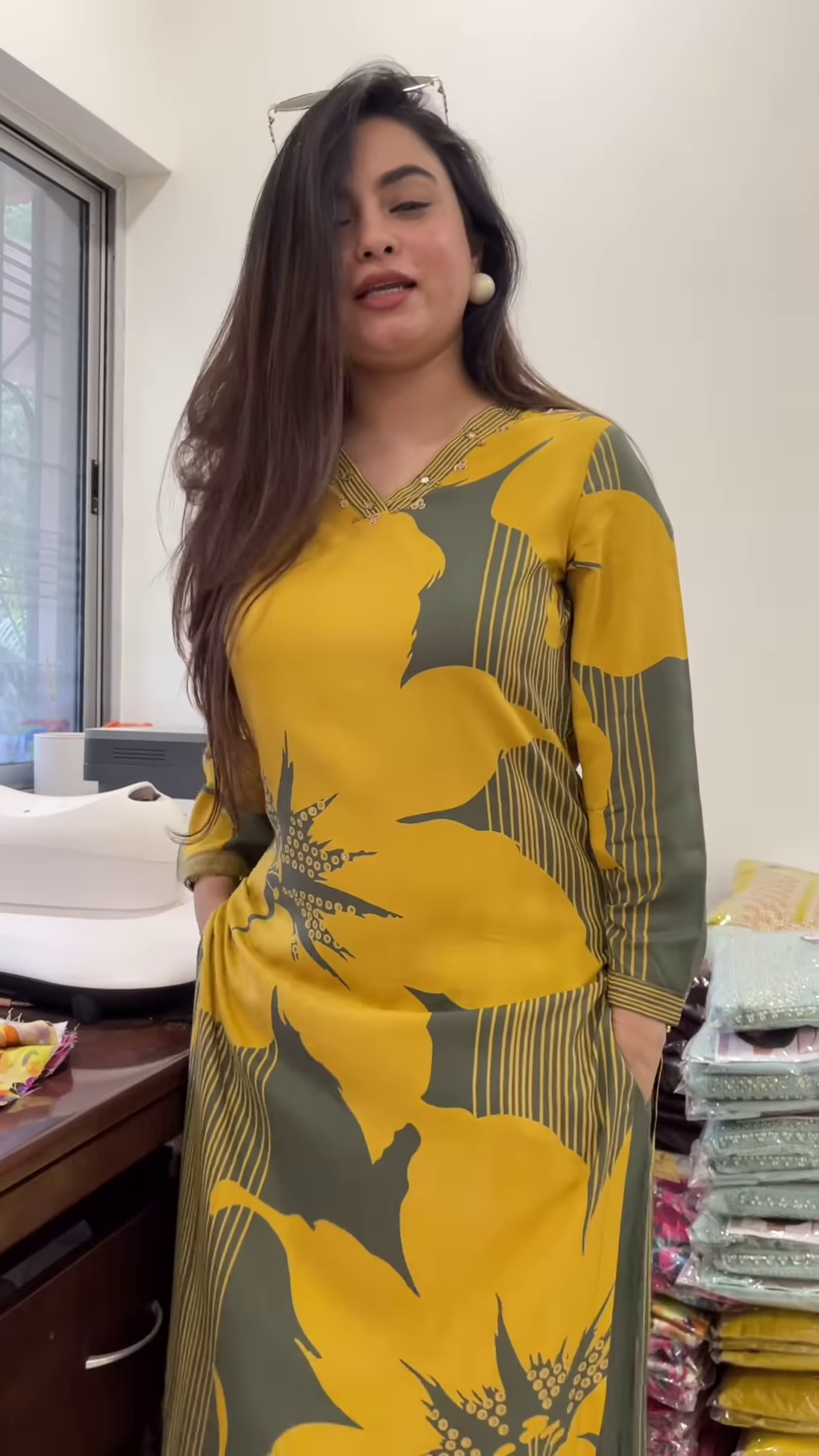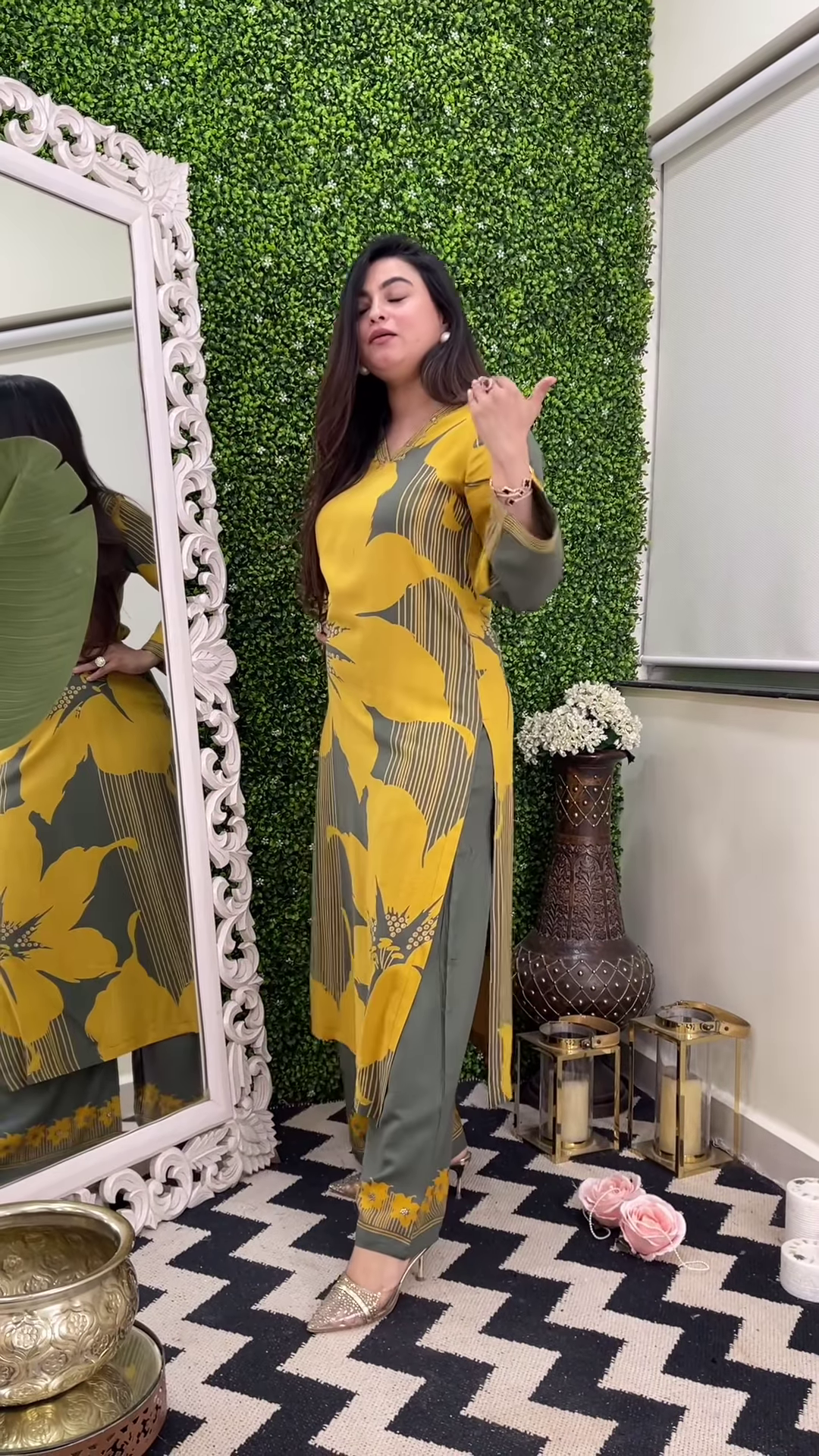 This contemporary kurti combines traditional styling with modern floral aesthetics for a sophisticated yet vibrant look. The contrast between the rich mustard yellow florals and olive green base creates a stunning visual appeal suitable for multiple occasions.